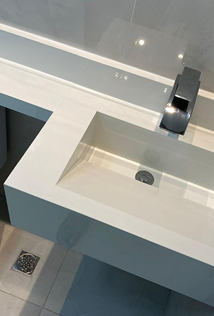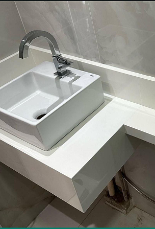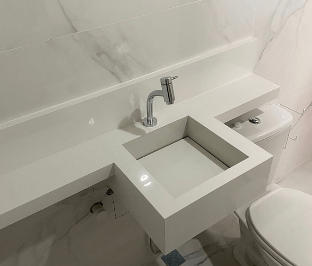 A pia esculpida em porcelanato é sinônimo de modernidade. Além do design elegante, oferece alta resistência, fácil limpeza e durabilidade, sendo perfeita para banheiros que buscam estilo e praticidade.