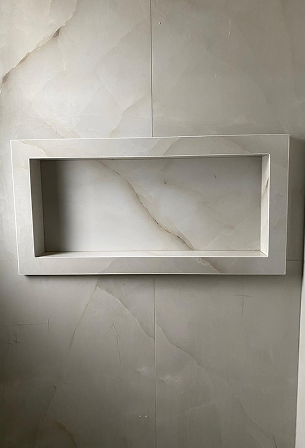 Os nichos em porcelanato são modernos e além de trazer praticidade ao ambiente, podem ser encontrados em diferentes estilos, como borda reta, borda de diamante, borda quadrada, borda infinita ou sobrepor.